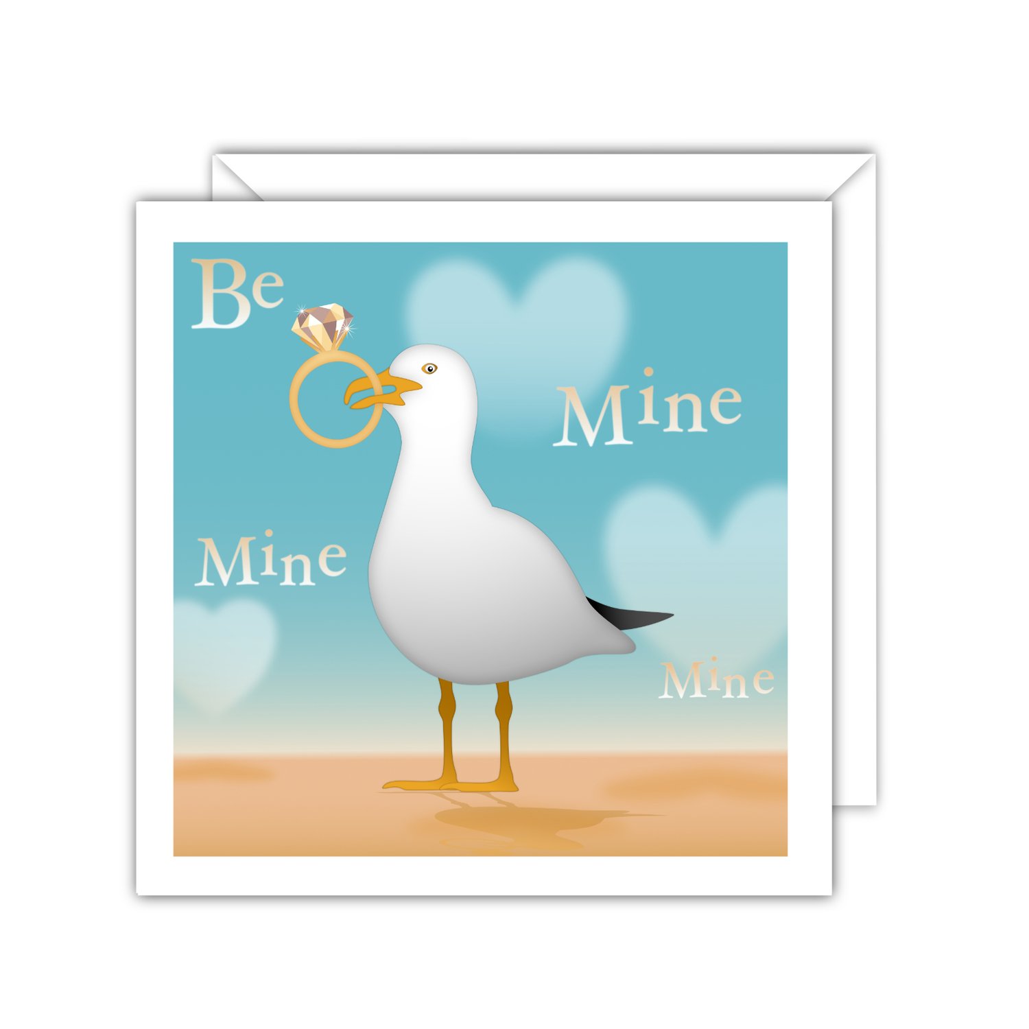 An engagement card for fiancee with a seaside twist, featuring a playful seagull holding a ring and the words "Be Mine, Mine, Mine." This quirky and fun design adds a unique touch to celebrating your special moment. Perfect for celebrating your future wife or husband, this fun and unique design is ideal for anyone who loves coastal vibes and a touch of humour on their special day.