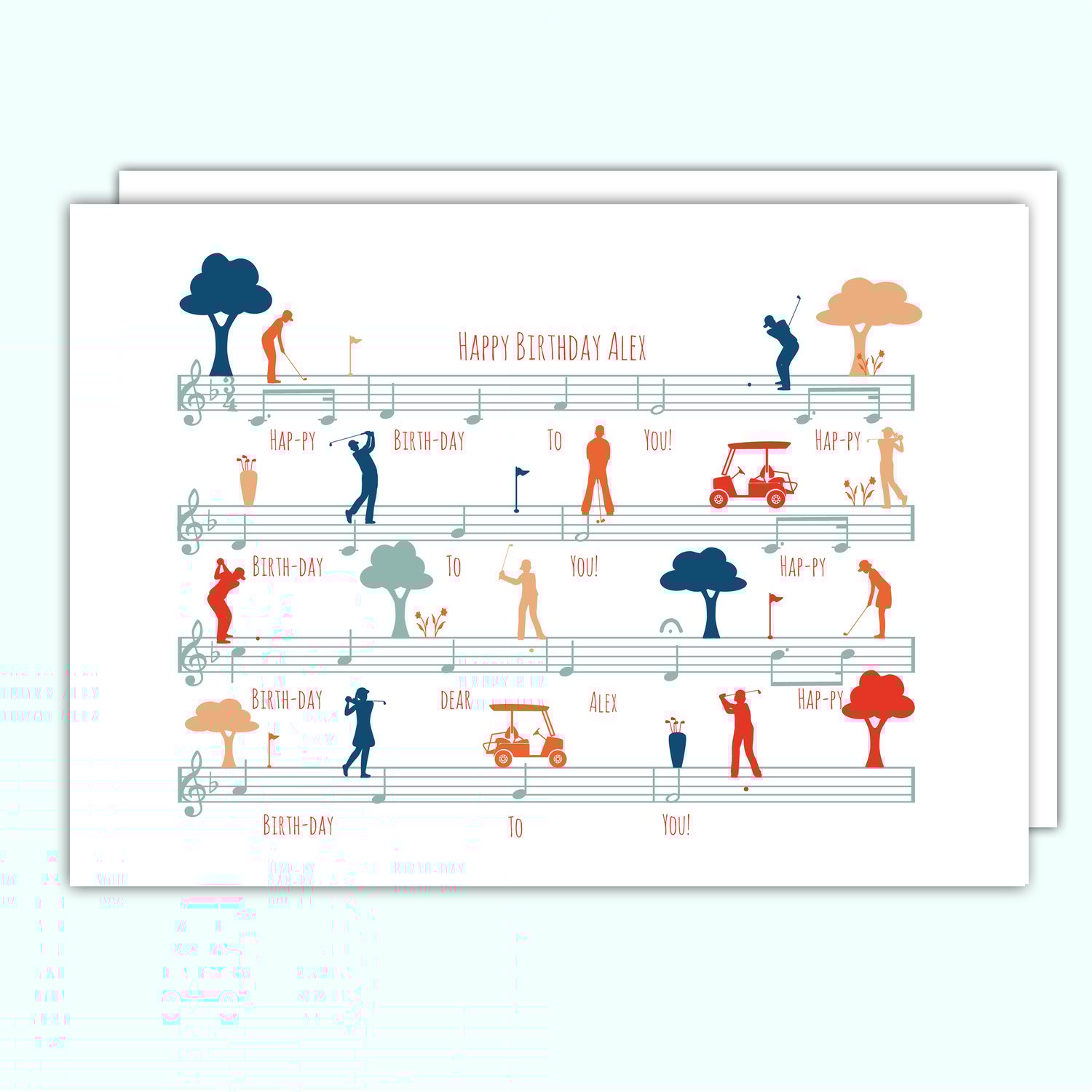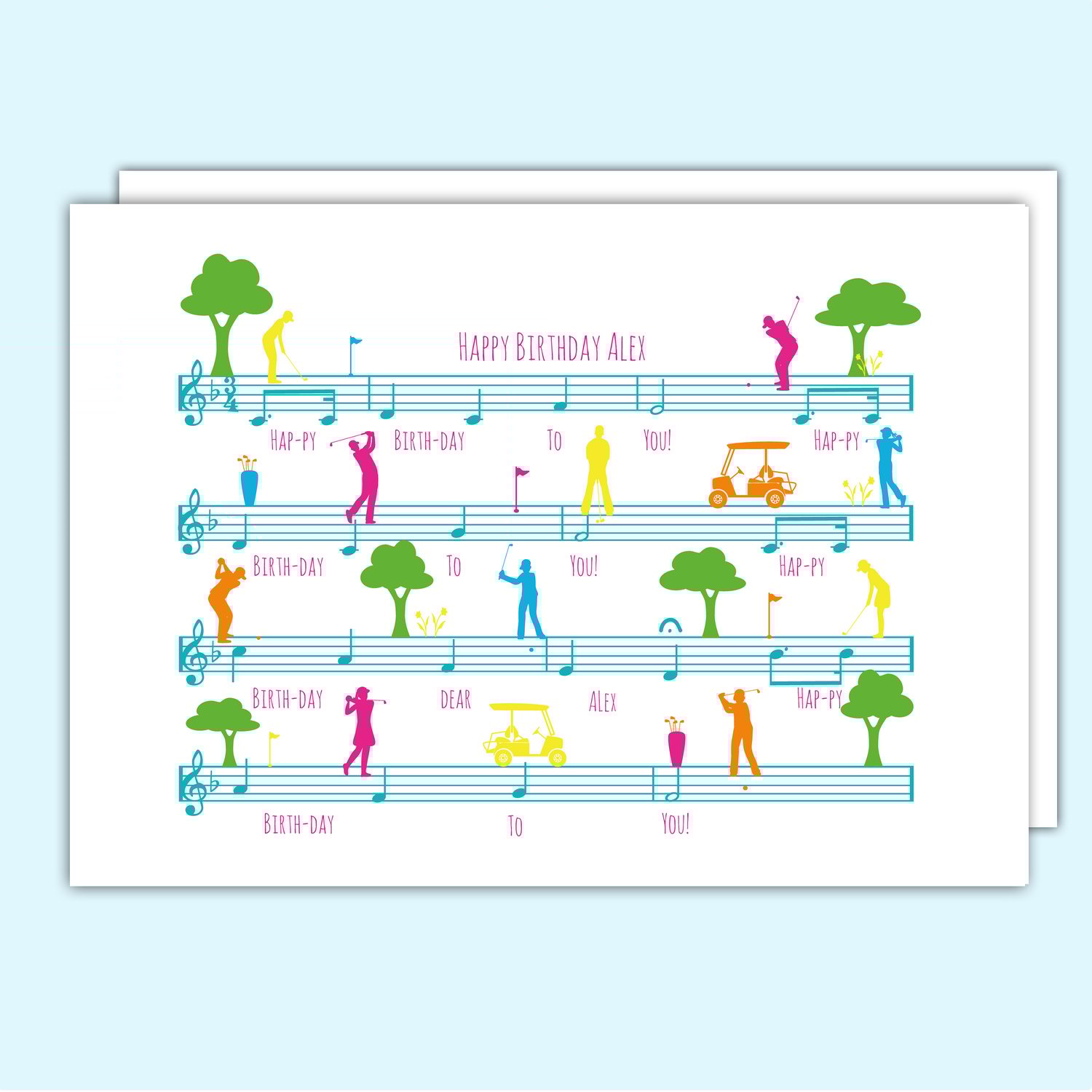 Tee up the perfect birthday surprise with this quirky golfer birthday card, featuring the classic Happy Birthday sheet music with playful little golfers swinging across the notes. A fun design that blends sport, humour, and music.